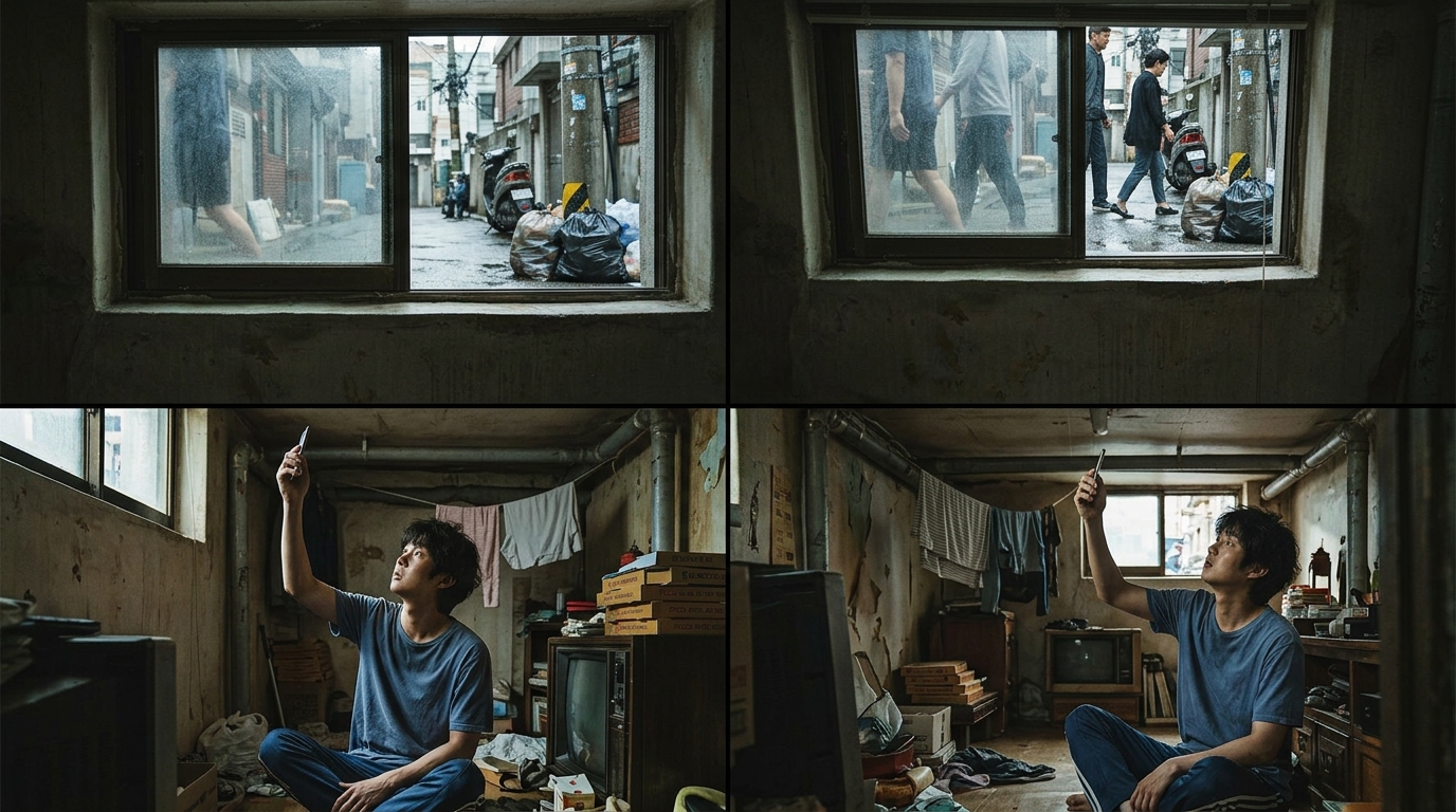 잠시 실제 사례를 떠올려 볼까요? 봉준호 감독의 **<기생충>**을 보면, 영화의 첫 장면은 반지하 집 창밖으로 보이는 거리를 비추며 시작됩니다. 카메라는 아래로 훑고 내려와 기우(최우식)를 보여주죠. 이 짧은 수직적 움직임만으로도 영화 전체를 관통하는 '계급의 수직 구조'를 이미 다 설명한 셈입니다.